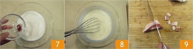 Now pour the buffalo milk into a bowl and infuse the saffron threads 7. Stir with a whisk 8 until the saffron has dissolved and the cream has taken on the same color as the yolk. Now take care of the guanciale. Cut the 200 grams into larger cubes 9.