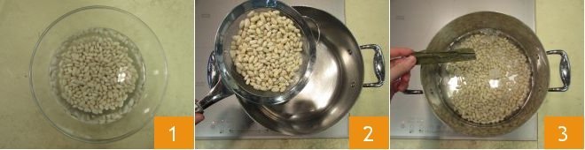 Let the beans simmer for about 75 minutes, making sure they are sufficiently soft. Then remove the seaweed 4 and season with salt. Blend everything 5 and strain to obtain a sort of broth; keep it warm by adding more water as needed 6.