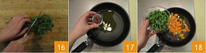 Finish with the sugar snap peas. After rinsing, trim them and cut them diagonally into 3/4-inch pieces 16. Move to the stove. Heat a pan with some oil. Heat it along with cleaned and crushed garlic and then the chili peppers 17. Add the carrots, sugar snap peas 18,