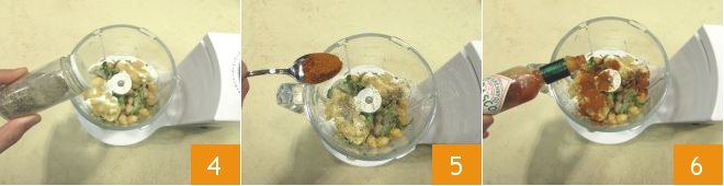 Peel the garlic, remove its core 16, and chop it into pieces. Then place the dried chickpeas, onion, and garlic into the blender jar 17 and add the cumin 18. Turn on the blades and blend until you get a homogeneous mixture.