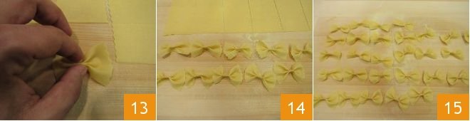 Then pinch in the center 13 to fix the shape of the farfalle 14; continue with all the dough. As you go, you can place them on a tray and finish the fresh pasta. As you make the farfalle, you can lay them on a slightly floured tray, perhaps with semolina flour if you prefer so that it is not absorbed by the fresh pasta 15, then let them dry for about 30 minutes. Your farfalle will cook in 5 minutes in boiling salted water to taste!