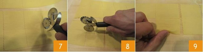 On the sheets you will get, pass a pasta cutter to make rectangles, like this: create vertical strips 3 inches wide with the scalloped side 7, then cut horizontally with the smooth side, to form sides of 1.5 inches 8. To form the farfalle, you'll need to use your thumb and index finger: with your thumb, lift one edge of the dough at the center of the rectangle 9