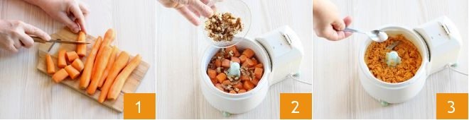 To prepare farfalle with carrot pesto, first bring a pot of salted water to a boil, which will be used to cook the pasta. Peel the carrots, rinse them and cut them into chunks 1. Transfer the carrots into a mixer and add the walnut kernels, keeping a few aside for garnish 2. Blend to reduce everything to a puree, then add the salt 3