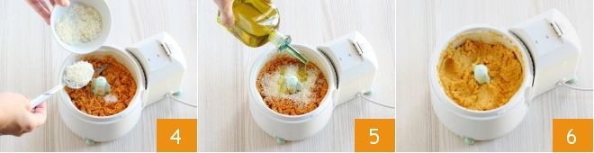 and the grated Grana Padano PDO cheese 4. Continue blending, gradually adding the oil 5 until you obtain a cream with a homogeneous consistency 6.