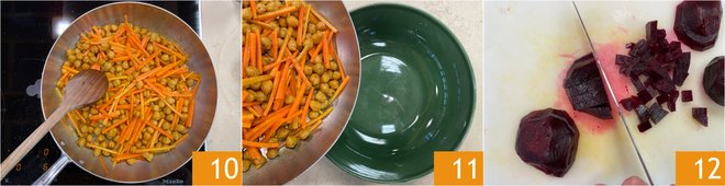 Sauté the chickpeas with the carrots for about 5 minutes 10, then transfer everything to a large bowl 11. Now cut the pre-cooked beetroot into cubes 12.