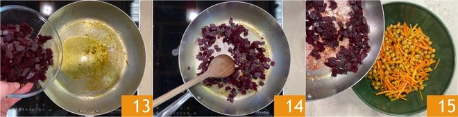 Add a drizzle of oil to the same pan used to cook the chickpeas, then add the beetroots 13 and toss them for just a couple of minutes 14. Transfer the beetroots to the bowl with the chickpeas and carrots 15.