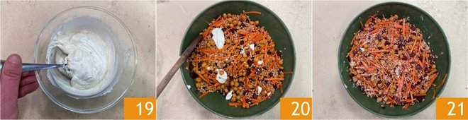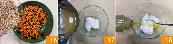 Add the warm farro as well 16 and mix everything together. Finally, make the yogurt sauce: in a small bowl pour the Greek yogurt, the lemon juice 17 and the oil 18, then season with salt and pepper.