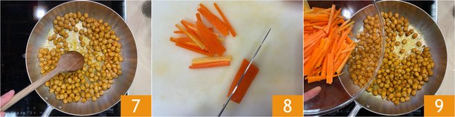 Let the chickpeas brown over medium-low heat for 5-6 minutes 7, stirring often. In the meantime, peel the carrots and cut them into julienne strips 8. Once the chickpeas are golden, add the carrots 9.