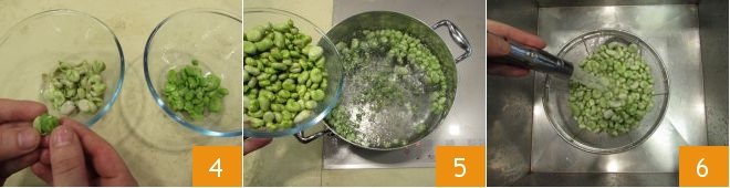 Put a pot of water on the fire and bring it to a boil. Meanwhile, remove the growth covering the seed and shell again; this way, you'll have the tenderest and sweetest part of the seed 4. When the water is boiling, drop in the shelled seeds 5, letting them cook for no more than 4 minutes since they should remain a bit crunchy. At the end of cooking, rinse them under running water and let them drain 6.