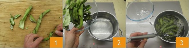 To prepare the fava pod omelette, first remove the string from the fava pods 1. Then blanch them in boiling salted water for about 15 minutes after it starts boiling. Then drain them 3 and let them cool slightly.