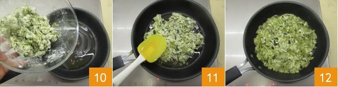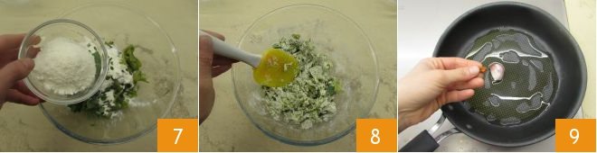 and grated Pecorino cheese 7. Season with salt and mix everything together 8. Heat a drizzle of oil in a pan, add a clove of garlic and the crumbled chili pepper 9. Let it fry, then remove the garlic clove
