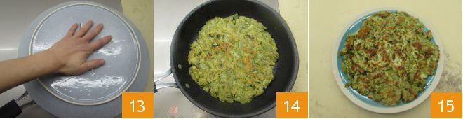 then using a plate, flip the omelette 13 and finish cooking for another 10 minutes on the other side 14. Transfer to a serving plate and serve the fava pod omelette hot 15!
