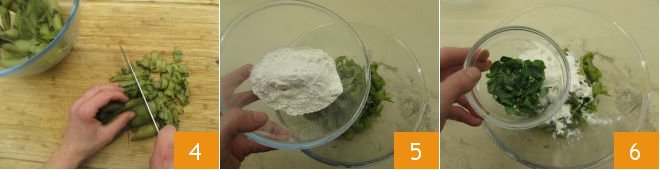 Cut them into coarse pieces with a knife 4 and transfer them to a bowl. Add the flour 5, plenty of mint leaves 6,