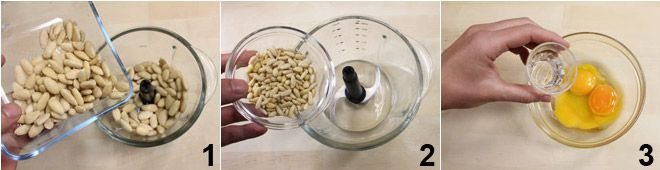 To prepare the Beans of the Dead, start by finely chopping the almonds in a mixer 1 (be careful not to heat them too much, or they will release oil), and then the pine nuts 2. In a bowl, beat the egg and yolks with the grappa 3.