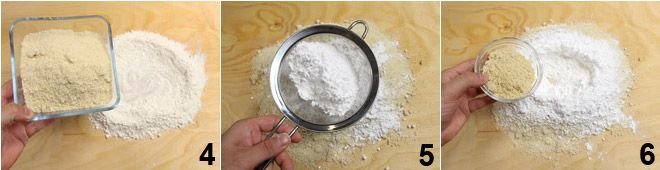 On a floured board, place the flour 4, the chopped almonds 4, and sift the powdered sugar 5. Also add the pine nuts turned into flour 6 and mix the powders with your hands, forming a well in the center.
