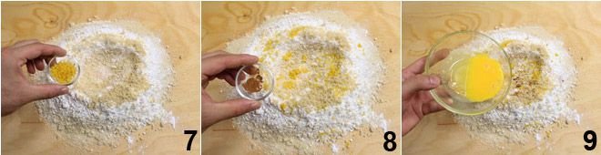 Finally, add the grated zest of an untreated lemon 7 and the cinnamon 8. Once all the ingredients are used up, pour the beaten eggs with the grappa into the center of the well 9 and
