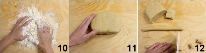 begin kneading with your hands 10 until you obtain a compact and moldable dough 11. Cut off one piece of dough at a time and roll it into a sausage shape with a diameter of approximately 3/8 inch, then divide it into pieces also about 3/8 inch wide 12.