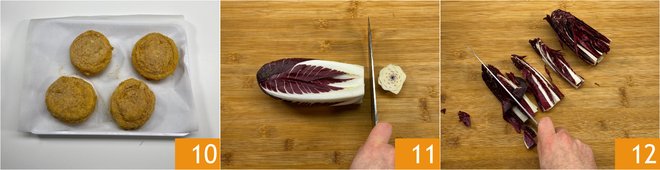 Mold it with your hands to keep the shape and place the cordon bleu on a tray lined with parchment paper. Continue in this way to make all the others; with these quantities, you will get 4 10. Prepare the accompanying salad: remove the first leaves from the radicchio and take the base 11, then cut in half and into as many wedges as you can get 12.