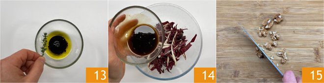 Prepare an emulsion of oil, balsamic vinegar, thyme leaves, salt, and pepper 13. Season the radicchio with the emulsion 14. Chop the walnuts 15.
