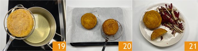 Fry the fennel cordon bleu, no more than 2 at a time, in deep oil at 340°F 19. After a couple of minutes, they will be golden brown, so drain them 20 and serve them with the accompanying salad 21!