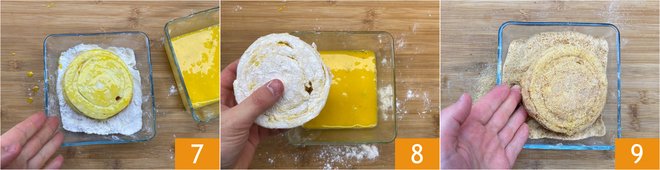 Pass the cordon bleu again in the flour 7 and in the eggs 8, and finally cover it with breadcrumbs 9.