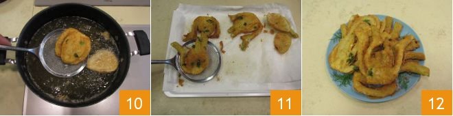 After 1-2 minutes, when they are golden brown, drain them 10 and transfer them to a tray lined with paper towels to remove the excess oil 11. As soon as you have finished frying them, transfer them to a serving dish and serve the fennel cutlets hot 12.