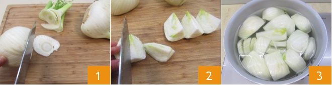 To prepare the fennel gratin with béchamel, first trim the fennel by cutting off the tips and the base 1. Remove the tougher outer leaves, halve them and wash under running water, then cut into fairly large wedges 2. Immerse the fennel in plenty of boiling salted water 3 and blanch for 5-6 minutes.