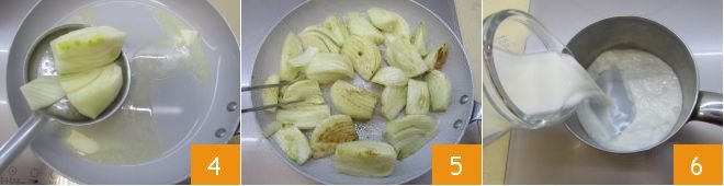 In a large skillet, melt 2 1/2 tbsp butter over low heat. When the butter has melted, drain the fennel well and place them in the skillet 4. Brown them for about 5 minutes, turning occasionally so they form a crust on both sides 5. Once ready, turn off the heat and prepare the béchamel: heat the milk in a saucepan 6.