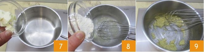 In another small saucepan, melt 2 tbsp butter 7, then add the sifted flour gradually 8, whisking continuously to prevent lumps from forming 9.