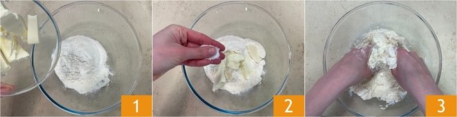 To prepare the fennel tatin, start with the shortcrust pastry: in a bowl combine the flour and cold butter 1, add the salt 2 and work with your fingertips until you obtain a sandy mixture 3.