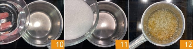 Move on to the caramel: in a small saucepan pour the water 10 and the sugar 11 and heat over medium heat 12.