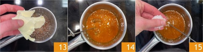 When the caramel has reached an amber color, add the butter 13 and stir with a whisk, just long enough to combine 14. Finally, add the salt 15 and turn off the heat.