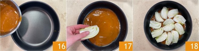 Now take a nonstick pan with a diameter of 10 1/4 in (better if lightly preheated in the oven) and pour the caramel inside 16. Spread it to cover the entire base, then place the fennel wedges 17 to form a rosette 18.
