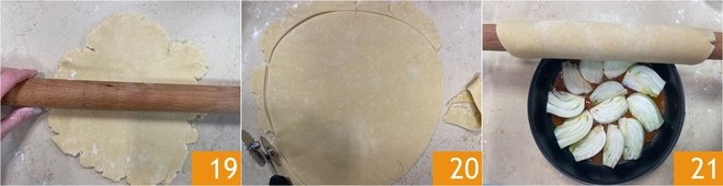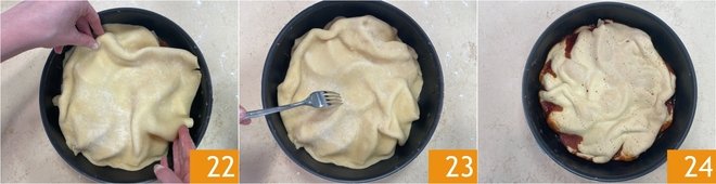 At this point take the shortcrust pastry and roll it out with a rolling pin to a thickness of 1/4 in, dusting with a pinch of flour 19. Cut out a disc slightly larger than the pan 20. Roll the dough around the rolling pin and unroll it over the pan 21.