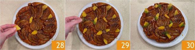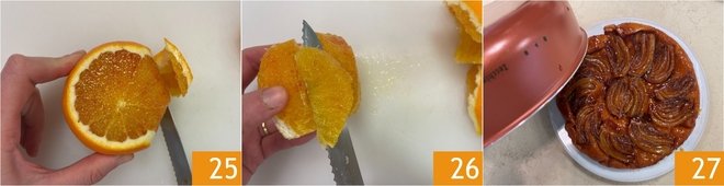After the baking time, remove from the oven and let cool for about ten minutes. Meanwhile, segment the orange: remove the peel and pith with a serrated knife 25 and extract the segments by cutting the flesh between the membranes 26. Finally cut the segments in half. Once slightly cooled, invert the tatin onto a serving plate 27.