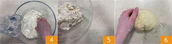 Pour in the cold water 4 and continue kneading with your hands, first in the bowl and then on the work surface 5. When you've formed a smooth, homogeneous dough 6, wrap it in clingfilm and place it in the refrigerator while you proceed with the rest of the recipe.