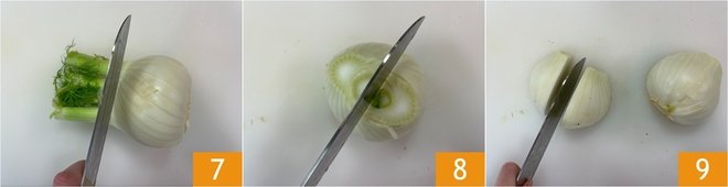 Take care of the fennel: remove the ends 7, cut them in half 8 and then slice into wedges 9. Set them aside.