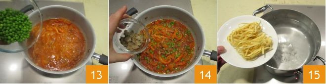 Add the peas 13, the previously sliced truffle 14, and let it cook for another 5 minutes. In the meantime, throw the pasta into plenty of boiling, salted water to taste 15;