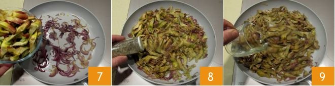 then cut the artichoke hearts in half, remove the inner choke, and cut them into quarters 4. Clean and slice the red onion into julienne strips 5 and sauté it in a large pan drizzled with olive oil 6.