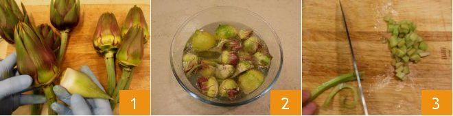 To prepare fettuccine with artichokes and bacon, start by bringing a pot of salted water to a boil and by How to clean artichokes, but before touching them, protect your hands with latex gloves or rub lemon on your skin to prevent them from turning black. Remove the thicker outer leaves 1 until you reach the tender ones, then, with a knife, cut off the tougher tips and also remove the stem. Place the flowers and stems in a basin filled with water and lemon to prevent them from browning 2. Now peel the stems, removing the most fibrous outer part, and chop them finely 3,
