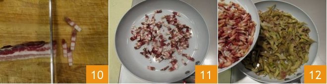 Meanwhile, cut the bacon into thin strips 10. Sauté it in a non-stick pan without adding any additional fat, to render it crispy 11: it will take just a few minutes, and when it's ready, you can add it to the artichokes 12 and continue cooking the sauce over low heat, mixing the ingredients well.