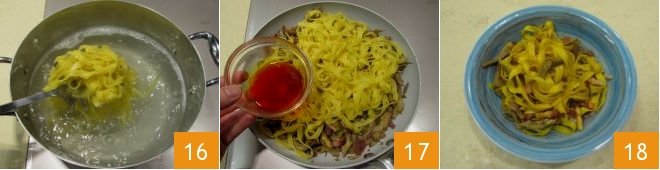When they are cooked, drain the fettuccine directly into the sauce using a slotted spoon 16. Add the diluted saffron 17, carefully mix the ingredients over high heat to distribute the flavors.