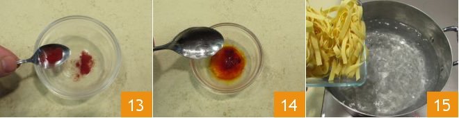 In a bowl, place the saffron 13, dilute it with a little water 14, and after dissolving it with a teaspoon, set it aside. Cook the fettuccine in the boiling salted water 15: it will take just a few minutes.