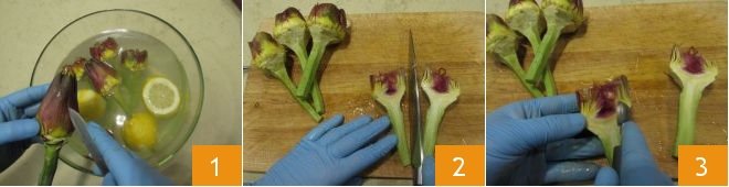 Then remove the outermost part of the stem using a peeler and cut the stem into pieces 4 and the artichoke hearts into slices 5. Keep the artichoke pieces in the acidulated water 6.