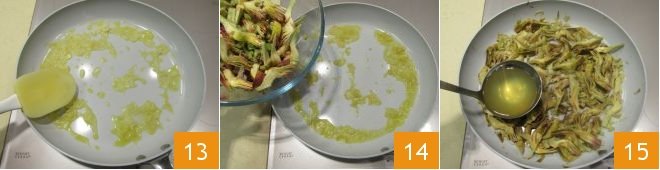 When the shallot is softened 13, add the artichokes drained from the acidulated water 14, add a ladle of vegetable broth 15,