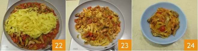 and pour them directly into the pan with the sauce 22. Sauté the fettuccine in the artichoke and shrimp tail sauce 23 to flavor them, and then serve them hot 24.