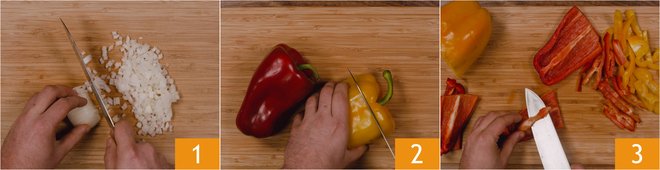 To prepare fettuccine with peppers, first chop the onion 1, then clean the peppers: remove the cap 2, remove the core with the stem, seeds, and white ribs 3.