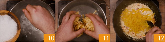 Put a pot with plenty of salted water on the stove 10 where you will cook the fettuccine al dente 11. As soon as the fettuccine are almost cooked, drain them and stir directly in the pan with the vegetable sauce 12.