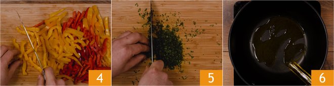 Then cut the peppers into sticks 4 and chop the parsley 5. Heat a pan on the stove with a swirl of oil 6.