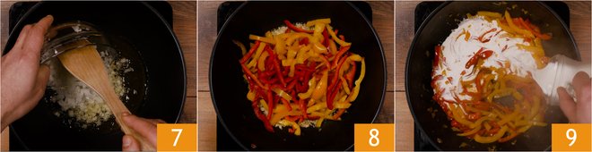 Add the onion and let it soften 7. When it is well softened, add the peppers and cook over medium heat for 10-15 minutes 8. Season with salt, pour in the cream 9, and finish cooking the sauce over low heat.